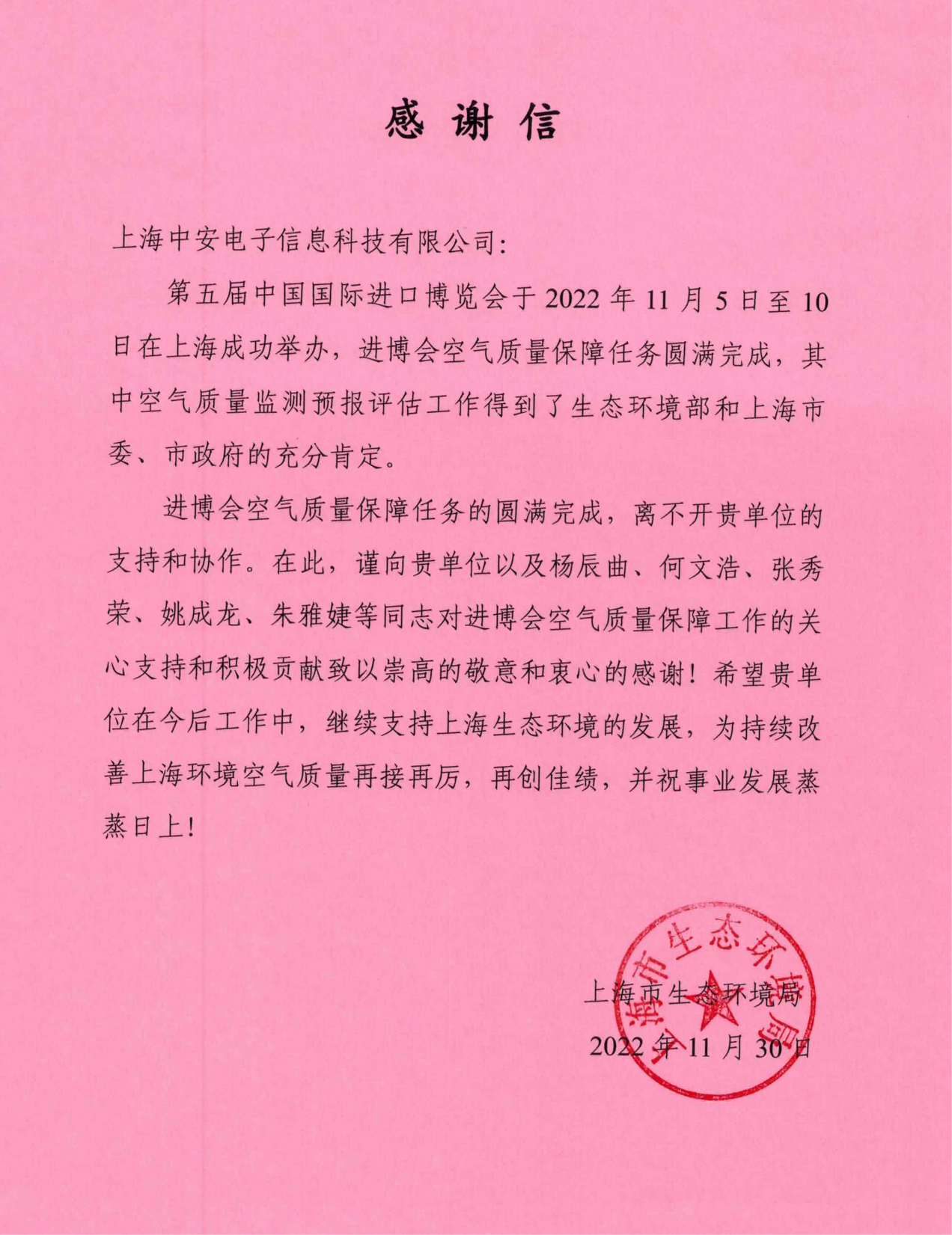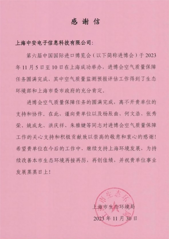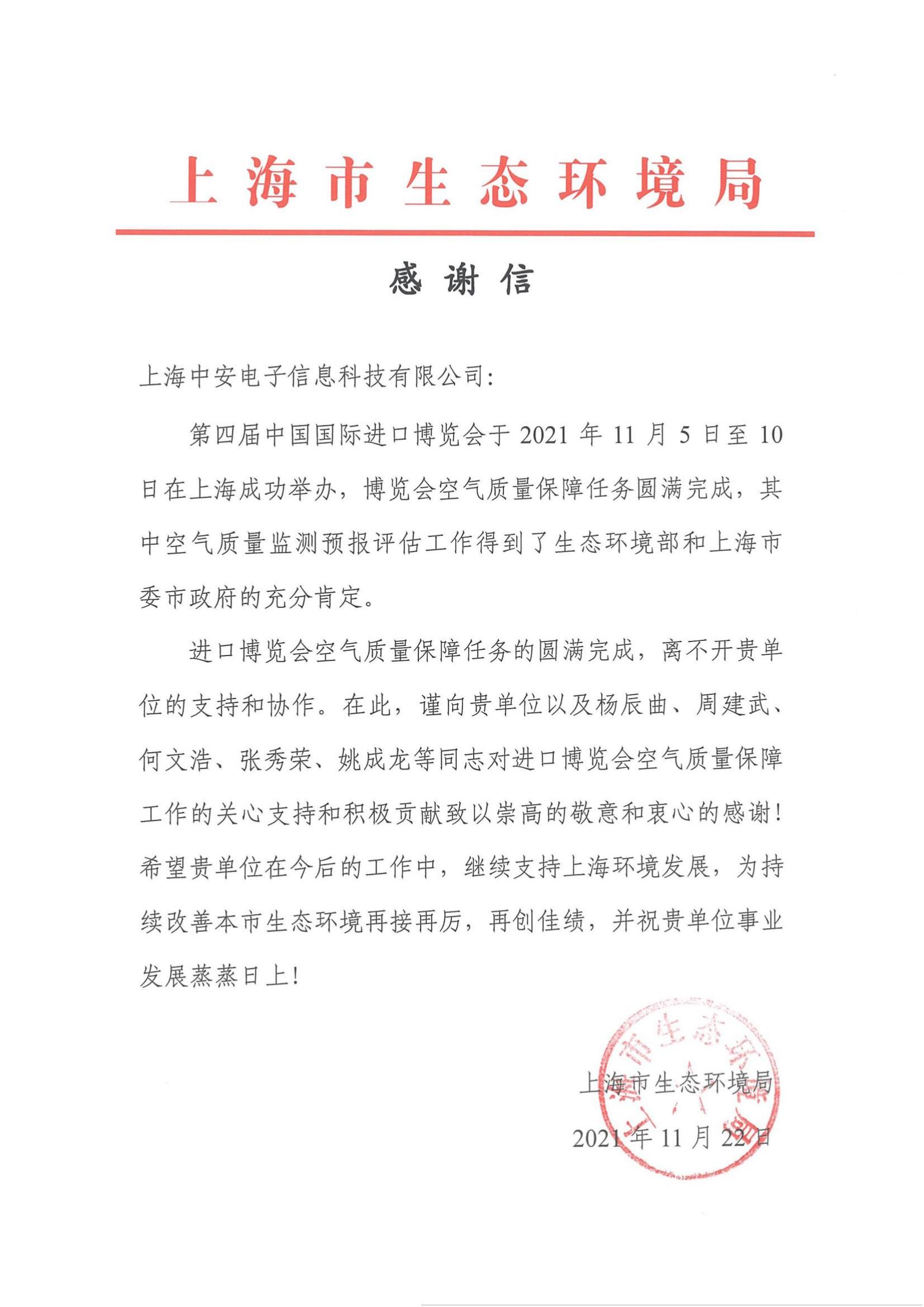 上海環(huán)監(jiān)中心就中安科技在21年國際進博會空氣質(zhì)量監(jiān)測預(yù)報工作中杰出貢獻送來感謝信?。?021/12/31)